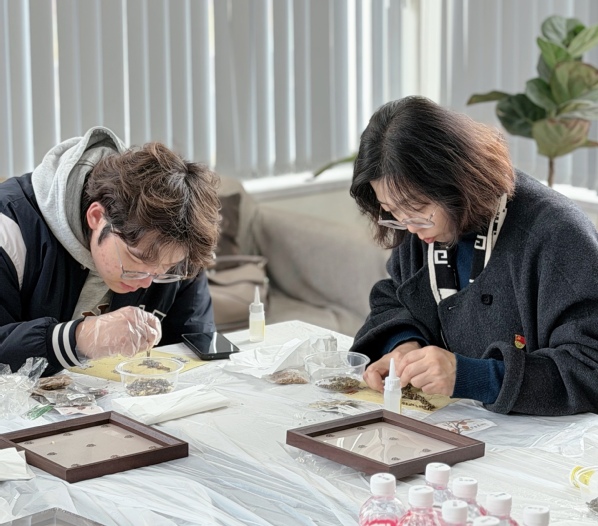 最后,党员们亲身体验非遗技艺。在专业老师的指导下,党员们参与了“非遗匠心·中草药创意画”手工制作活动。大家从认识草药、了解其特性入手,亲手摆弄各类中草药素材,发挥创意进行构图粘贴,在“就地取材、因材施艺”的非遗智慧中,完成了一幅幅独具韵味、可长久保存的天然艺术品。此次实践钟,不仅让大家领略了中医药文化的自然美感与哲学内涵,更使之前所闻所见的“工匠精神”内化于心,增强了文化自信与使命担当。