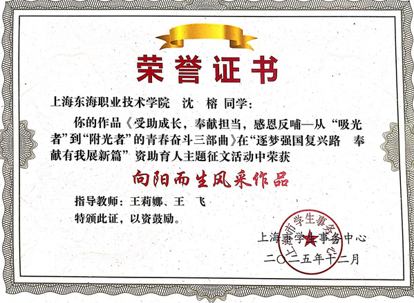本次征文活动设置“卓越典范风采作品”“逐梦星辉风采作品”“薪火相传风采作品”“向阳而生风采作品”四大奖项类别。其中,我校机电学院沈榕同学的作品《受助成长,奉献担当,感恩反哺——从“吸光者”到“发光者”的青春奋斗三部曲》,以自身成长经历为蓝本,生动诠释了东海学子在资助政策护航下,从汲取温暖到传递光亮的蜕变历程,最终荣获高等教育组“向阳而生风采作品”奖,充分展现了我校受助学子自强不息、笃行不怠的青春风采。
