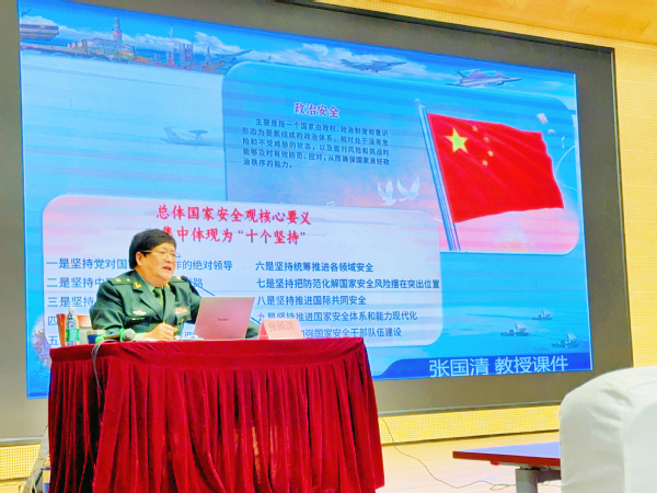 讲座中,张国清教授立足当下国际国内安全形势,结合我国国防建设历程与新时代强军成就,用通俗易懂的语言、详实的案例数据,围绕国防历史回顾、现代国防建设成果、总体国家安全观、青年学生的国防义务与担当等核心内容展开细致讲解。他将中国共产党成立105周年的光辉历程和红军长征胜利90周年的精神伟力融入讲座内容,引导同学们从红色历史中汲取信仰力量,自觉把爱国情、强国志转化为报国行;鼓励在场学生主动学习国家安全知识,积极参与国防教育实践,从日常小事做起,不断提升自身综合素质,为维护国家安全贡献青春力量。